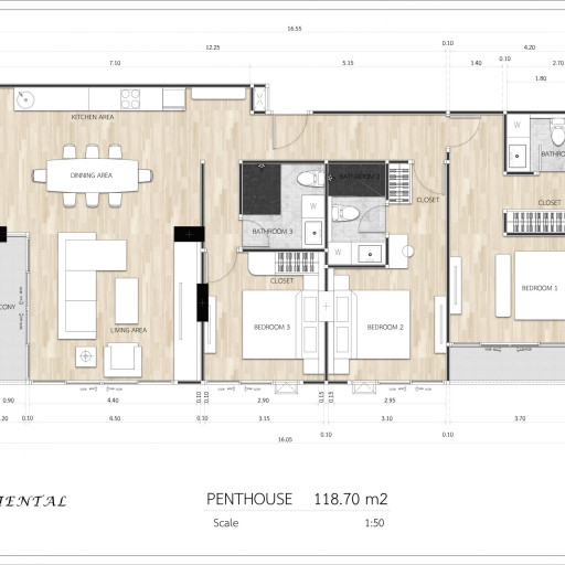 The apartments are equipped with a provision system for kitchen extractor installation, ensuring efficient ventilation. Each room features an individual air conditioning unit, allowing precise climate control and maintaining a comfortable indoor environment throughout the living space.